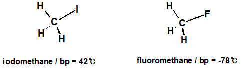 그렇다면 iodomethane과 fluoromethane는 어떨까요? 우리는 아이오딘이 플루오린에 비해서 더 높은 분극률을 가지고 있다는 사실을 알고 있기 때문에 iodomethane이 fluoromethane에 비해서 강한 intermolecular forces를 가지며, 더 높은 끓는점을 가지고 있을 것이라는 것을 알 수 있습니다!