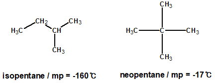 비슷한 분자량과 같은 작용기를 가지는 화합물들에 대해서 더욱 compact 하고 대칭적인 모양을 가지는 화합물이 그렇지 않는 화합물보다 높은 녹는점을 가지게 됩니다. 그 이유는 neopentane과 같은 분자들은 compact하고 대칭적이기 때문에 결정격자에 packing이 잘 되는 반면, isopentane은 그렇지 않기 때문입니다.