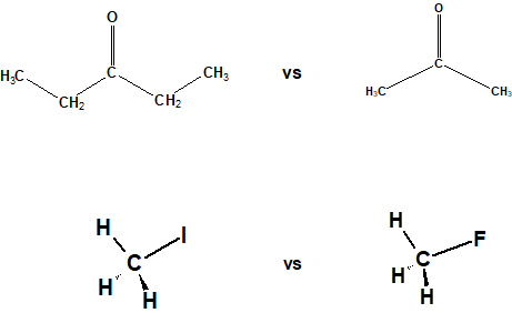 이번에는 3-pentanone과 acetone을 비교해봅시다. 3-pentanon과 acetone은 카보닐기(carbonyl)라는 같은 작용기를 가지고 있지만, 3-pentanone는 더 큰 표면적을 가지고 있다는 것을 알 수 있습니다. 그렇기 때문에 3-pentanone은 acetone에 비해서 강한 intermolecular forces를 가지며, 더 높은 끓는점을 가지고 있을 것이라는 것을 알 수 있습니다.