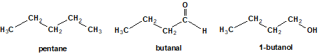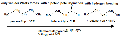 먼저 분자량이 거의 비슷한 분자들인 pentane과 butanal, 1-butanol을 비교해봅시다. pentane의 경우에는 작용기를 가지고 있지 않지만, butanal과 1-butanol은 각각 카보닐기(carbonyl group)과 하이드록시기(hydroxy group)를 가지고 있습니다. 세 개의 분자들은 분자량과 표면적도 비슷하기 때문에 거의 유사한 van der Waals forces를 가질 것이라고 생각할 수 있지만 butanal과 1-butanol은 pentane과 달리 극성분자이기 때문에 dipole-dipole interaction을 가질 것입니다. 그렇기 때문에 두 개의 분자는 pentane에 비해서 intermolucular force가 강하다는 것을 알 수 있습니다.