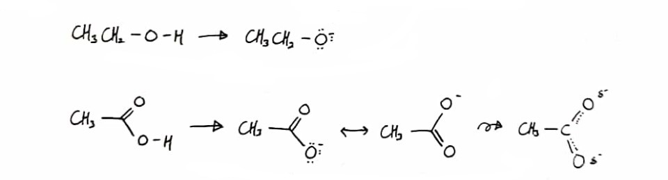 이러한 분석을 통해서 Ethanol과 Acetic Acid의 acid strength를 정성적으로 비교해 볼 수 있습니다. Acetate ion은 Figure 6처럼 2개의 Resonance Structure를 통해 resonance-stabilize되어 있기 때문에 ethoxide보다 안정합니다. 즉, Ethanol보다 Acetic Acide의 acid strength가 더 강할것이라는 것을 예측 할 수 있습니다. 이러한 접근법은 산의 세기를 생각할때 자주 활용됩니다.