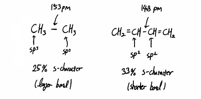 이러한 비정상적인 결합 길이는 hybridized orbital을 통해 설명될 수 있습니다. Ethane의 경우 탄소가 sp3 hybridized orbital을 가지고 있으므로 s orbital character는 25%라는 것을 알 수 있습니다. 하지만 1,3-butadiene의 경우 2,3번 탄소가 sp2 hybridized orbital을 가지고 있기때문에 s orbital character는 33%입니다. s-character가 높을수록 짧은 결합을 가지게 되므로 1,3-butadiene의 C-C single bond가 Ethane의 C-C single bond보다 짧은 길이를 가지게 되는 것입니다.