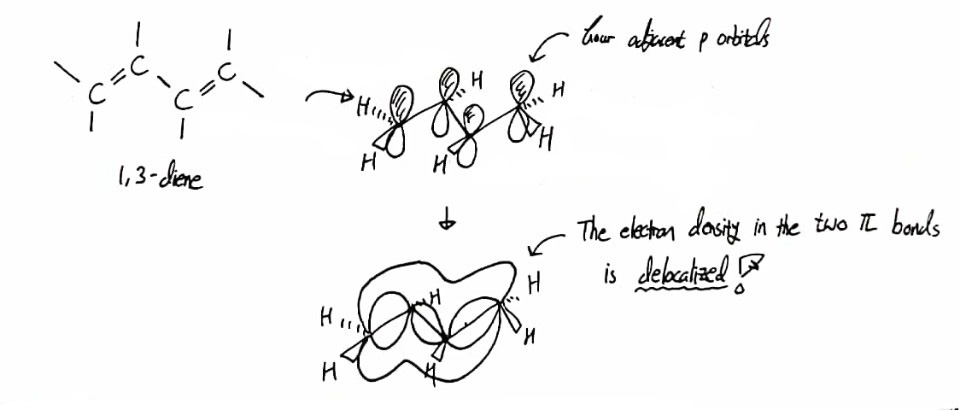 Conjugation은 세개 또는 그 이상의 인접한 원자들을 통해서 p orbital이 overlap될 수 있을때 나타나는 현상입니다. Figure 7의 이러한 환경에서 p orbital의 overlap을 통해 π-electron들이 delocalize될 수 있으며, 1,3-diene의 energy를 낮추며 더 안정한 분자로 만들어줍니다.