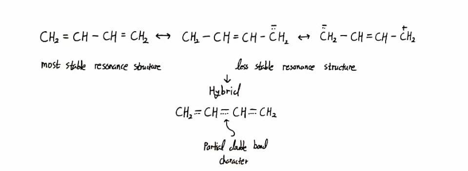 또한, 1,3-butadiene의 Resonance Structure를 통해서도 설명이 가능합니다. Figure 10에서 1,3-butadiene의 3개의 Resonance Structure를 확인 할 수 있습니다. 두번째와 세번째 resonance structure는 첫번째 resonance structure에 비해서 불안정하기 때문에 minor contributor임을 확인 할 수 있습니다. 이를 바탕으로 Resonance Hybrid를 그려보면 C2-C3 bond에 parital double bond character가 있음을 확인 할 수 있는데, 그렇기 때문에 일반적인 C-C single bond보다 짧은 길이가 나타나는 것 입니다.