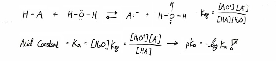 Figure 2는 Acid (H-A)가 물에 용해되는 과정을 나타내고 있습니다. 그에 따라서 평형 상수(Equilibrium Constant, Keq)를 세울 수 있는데, 이를 이용해서 새롭게 산 해리 상수(Acid Constant)를 정의합니다. Acid (H-A)가 proton을 더 잘 제공할수록(산의 세기가 세질수록) Keq의 값은 증가하게 될 것이고 그에 따라서 Ka 또한 증가하게 될 것입니다.
