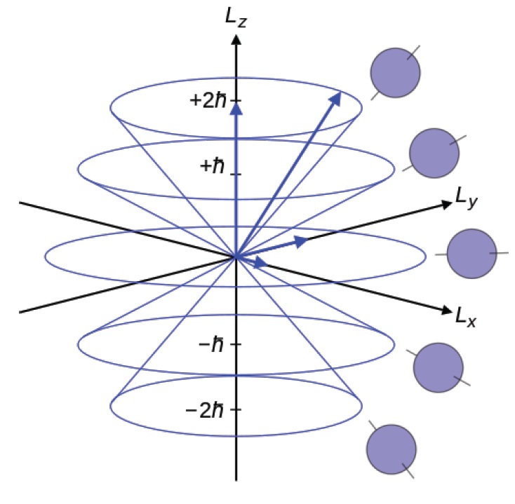 표현방법에서 알아챌 수 있듯이, Lz는 각운동량의 z-구성요소입니다. Figure 1을 참고하면 명확하게 이해할 수 있을 것입니다. 또한, 기댓값 <Lx>와 <Ly>도 0인 것을 알 수 있습니다. 이러한 결과를 설명하기 위해서 각운동량의 회전 벡터는 원뿔의 가장자리에 있어야 합니다. 즉, 전자가 고정된 축을 중심으로 회전하는 것이 아니라 지구의 자전처럼 고정된 크기와 Lz 성분을 가지고 세차운동(Precession)을 한다는 것입니다.