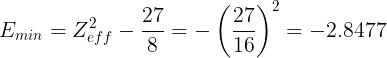 마지막으로, Equation (15)로 표현된 에너지를 최소화시키는 유효 핵 전하 (Zeff)를 찾아야 합니다. 편의를 위해 me4/16π2ε02ℏ2의 단위로 식을 전개하면,