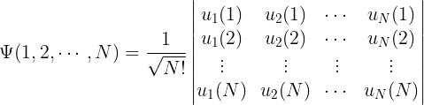 이때, u(i)는 공간 부분과 스핀 부분을 모두 포함한 파동 방정식입니다. Equation (21)은 비대칭 파동 함수를 만들어 주며, 그 함수를 결정 파동 함수(determinantal wave function)라고 부릅니다.