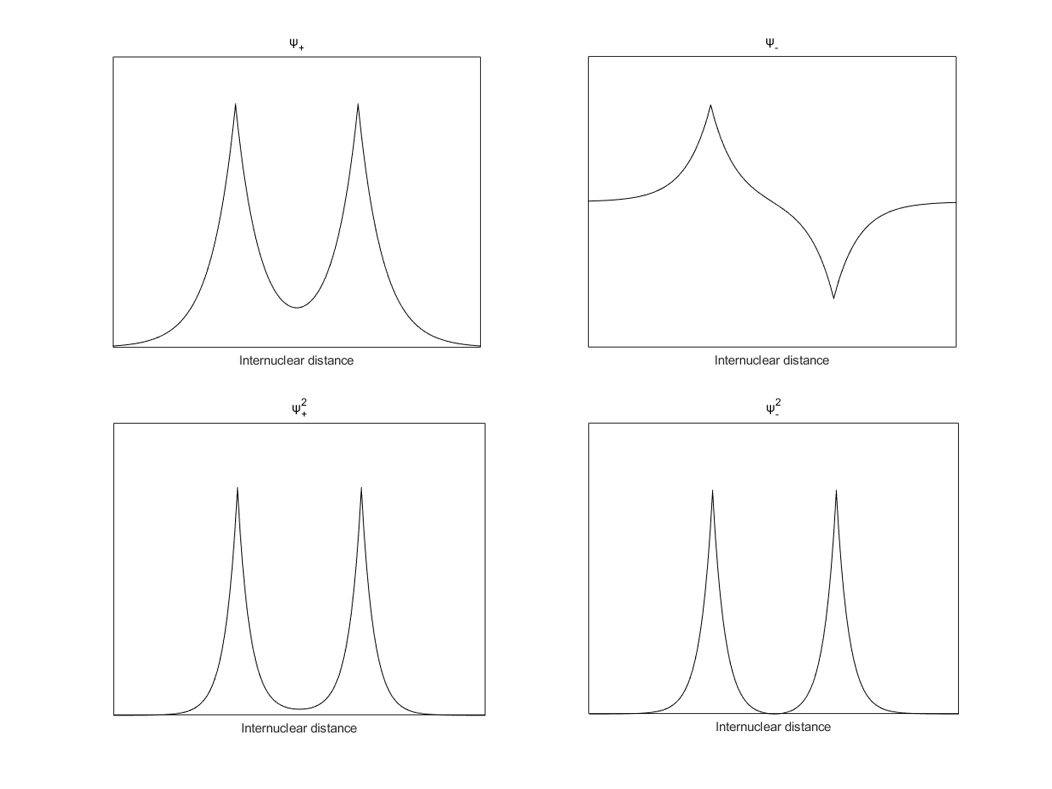ψ+와 ψ_는 모두 같은 원자 오비탈의 선형 결합으로 만들어집니다. 그러나 하나(ψ+)는 이온의 안정성을 표현하고 다른 하나(ψ_)는 불안정성을 표현합니다. 그 이유는 Figure 4를 통해 알 수 있습니다. ψ+는 Figure 4의 왼쪽에 있는 그래프로 표현되어있으며, ψ-는 오른쪽에 있는 그래프로 표현되어 있습니다. 이때, 두 번째 줄의 그래프에서 두 개의 핵(두 개의 피크) 사이에 전자가 존재할 확률을 잘 살펴봐야 합니다. ψ-의 경우 확률이 0이 되는 구간이 있지만 ψ+의 경우 0이 되는 구간이 없습니다. 즉, ψ-는 마디(node)가 존재하는 반면에 ψ+의 경우 마디가 존재하지 않습니다.