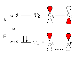 α와 β의 값은 실험을 통해 얻을 수도 있는데, 이때 β의 값은 대략 -75kJ/mol로 주어집니다. 그러므로 바닥상태의 전자 배치는 Figure 2로 표현할 수 있습니다. Equation (1)에서 2개의 원자 오비탈은 분자 오비탈을 형성할 때 동일한 비율로 기여할 것입니다 . 그러므로 정규화 상수 c1과 c2는 1/√2가 될 것입니다. 3
