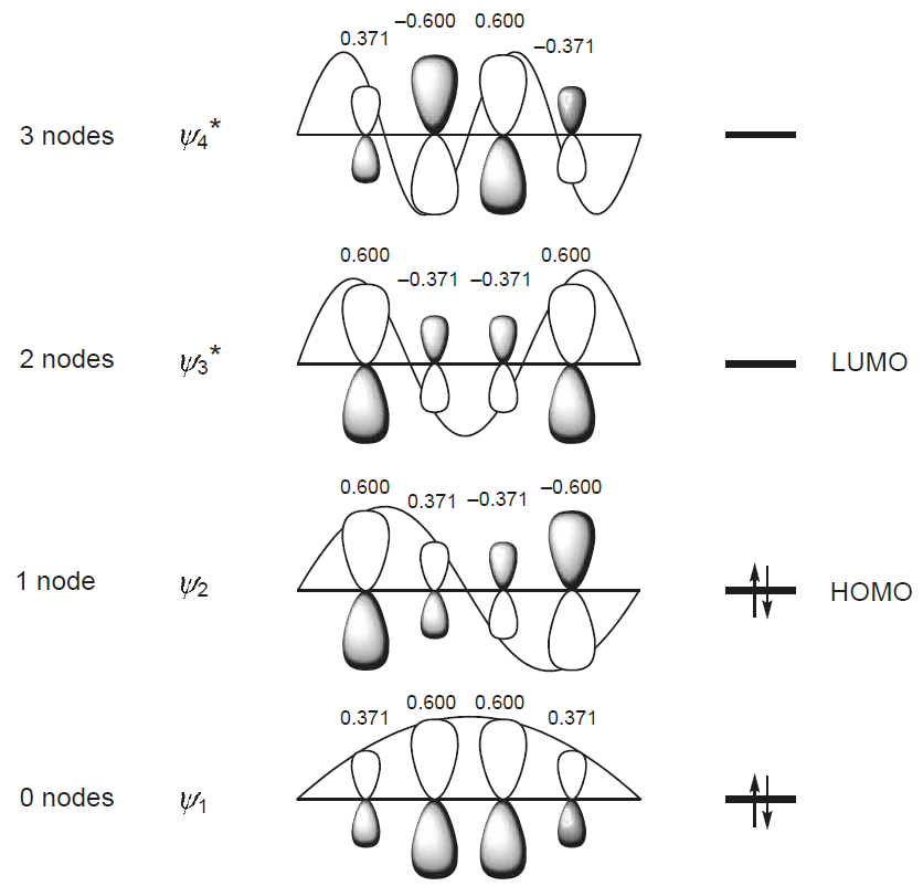 부타디엔(Butadiene)은 cis 와 trans 이성질체가 존재할 수 있지만 우리는 직선형 분자라고 간주해봅시다. 에텐과 동일한 방식으로 부타디엔의 π전자만을 고려할 것입니다. π 분자 오비탈은 4개의 2pz 오비탈에 의해 만들어 질 것입니다.