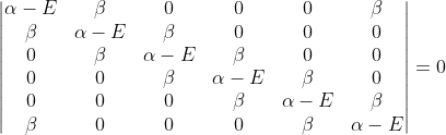 벤젠은 6개의 탄소를 가지고 있으므로 6개의 pz 오비탈과 6개의 π 전자가 π 분자 오비탈을 구성합니다. 이를 바탕으로 Secular determinant를 만들어 주면,