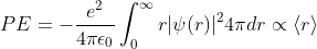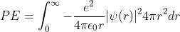 전하 +e를 가지는 원자 핵과 전하 -e를 가지는 전자 사이의 potential energy는 Equation (1)과 같습니다. 그렇다면 전자의 거동을 표현하는 함수를 파동 함수 ψ라고 가정하고, 확률 밀도 함수를 |ψ|2라고 정의해봅시다. 이를 이용해서 전자의 potential energy를 표현해보면,