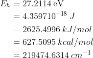 | hartree | 1 | 27.2114 | 219474.6314 | 2625.4996 | 627.5095 |