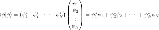브라와 켓은 각각 행 벡터(Column vector)와 열 벡터(Row vector)에 해당합니다. 특정한 고유 함수 집합 φ가 N차원 힐베르트 공간을 이루고 있다면, 브라는 Equation (5)와 같이 켓은 Equation (6)과 같이 표현합니다. 이때, *는 켤레 복소수입니다.